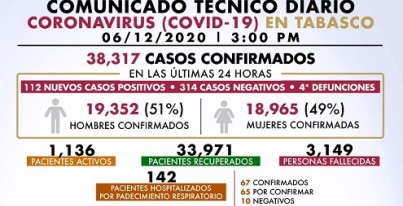 De acuerdo al Comunicado Técnico Diario, -emitido por el sector salud para que los ciudadanos conozcan el comportamiento del nuevo coronavirus-, Tabasco ya registra 38 mil 317 casos confirmados y 3 mil 149 personas fallecidas, así como 33 mil 971 pacientes recuperados, mil 136 activos, y 142 hospitalizados por padecimientos respiratorios.