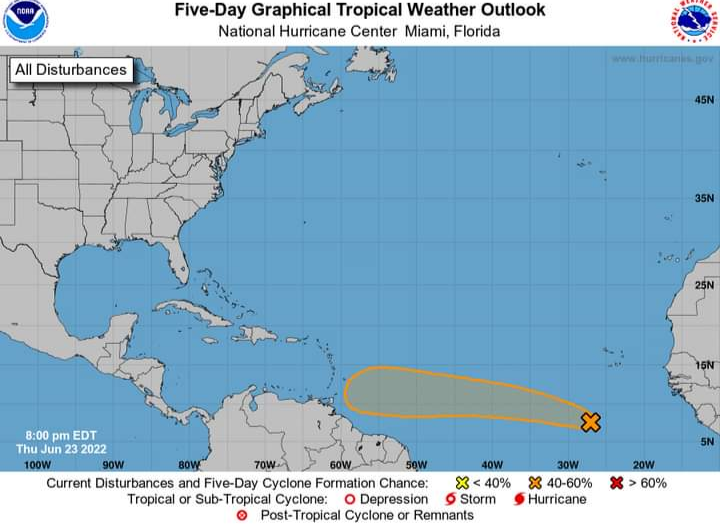 Este sistema se mueve hacia el Oeste a unas 15 milla por hora; presenta probabilidad de 20% a 48 horas y 40% a cinco días para desarrollo ciclónico. No representa ningún riesgo para las y los quintanarroenses, se vigila.