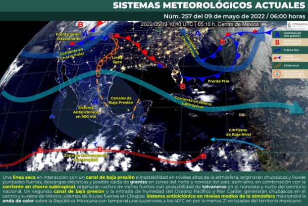 Finalmente, un sistema anticiclónico en niveles medios y altos de la atmósfera mantendrá la onda de calor sobre el territorio nacional, con temperaturas máximas superiores a los 35°C en gran parte del país, pudiendo superar los 40°C en zonas de Sonora, Chihuahua, Coahuila, Nuevo León, Tamaulipas, San Luis Potosí, Zacatecas, Durango, Sinaloa, Nayarit, Jalisco, Michoacán, Guerrero, Morelos, Puebla, Veracruz, Oaxaca, Chiapas, Tabasco, Campeche y Yucatán.