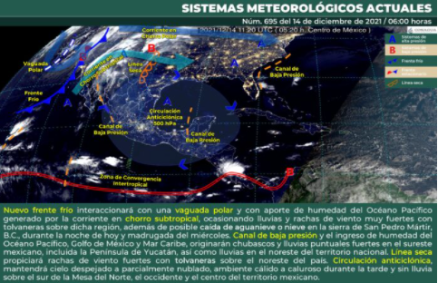 En el resto del País, una circulación anticiclónica en niveles medios de la atmósfera mantendrá cielo despejado a parcialmente nublado, ambiente cálido a caluroso durante la tarde y sin lluvia sobre el sur de la Mesa del Norte, el occidente y el centro del territorio mexicano.
