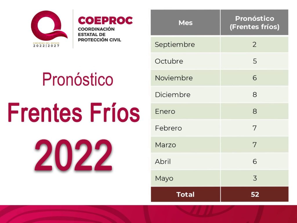 Poder y Crítica | Redacción | Alfredo Suárez Camacho, en cargado del despacho de la Coordinación Estatal de Protección Civil (COEPROC), dijo que el Servicio Meteorológico Nacional, esta pronosticando para la Temporada Invernal 2022-2023, la llegada de 55 frentes fríos a todo el país.