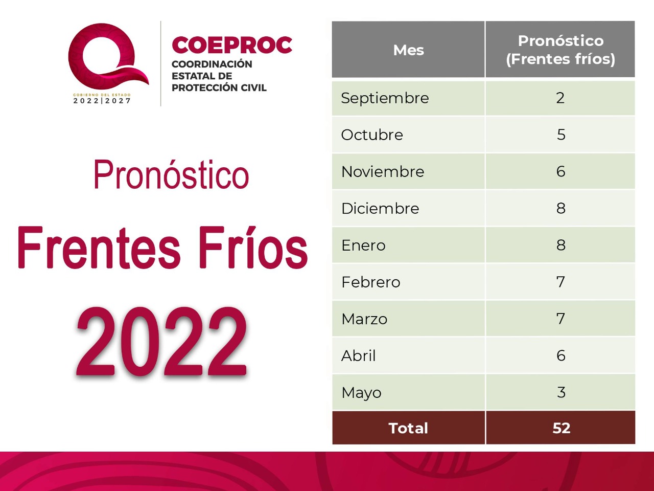 La República Mexicana, por su ubicación geográfica se ve afectada por diversos fenómenos meteorológicos, entre ellos los Frentes Fríos (FF), que comienzan su desplazamiento hacia el territorio nacional a partir del mes de septiembre y hasta el mes de mayo del siguiente año; la mayor frecuencia de estos sistemas meteorológicos ocurre entre noviembre y marzo, sin descartar que algunos frentes se desplazan antes del inicio y término de la temporada invernal y son conocidos como extemporáneos.