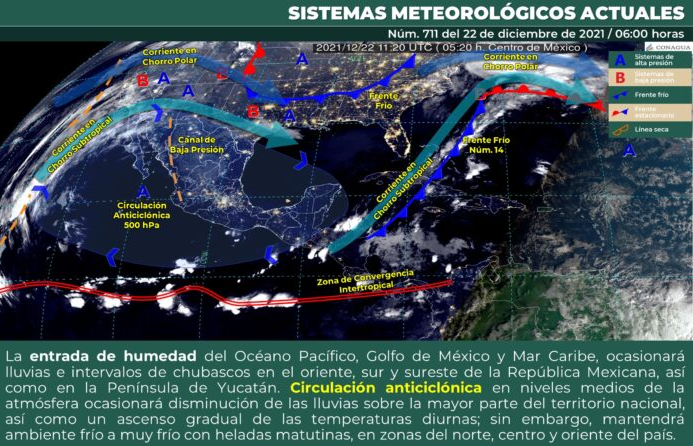 Por otra parte, una circulación anticiclónica en niveles medios de la atmósfera ocasionará disminución de las lluvias sobre la mayor parte del territorio nacional, así como un ascenso gradual de las temperaturas diurnas; sin embargo, mantendrá ambiente frío a muy frío con heladas matutinas, en zonas del norte, centro y oriente del país.
