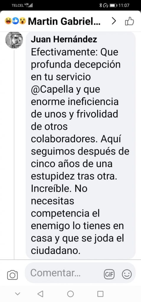 “Que profunda decepción en tu servicio @Aeromexico y que enorme ineficiencia de unos y frivolidad de otros colaboradores. Aquí seguimos después de cuatro horas de una estupidez tras otra. Increíble. No necesitas competencia el enemigo lo tienes en casa y que se joda el usuario”; fue esa la publicación de Capella.