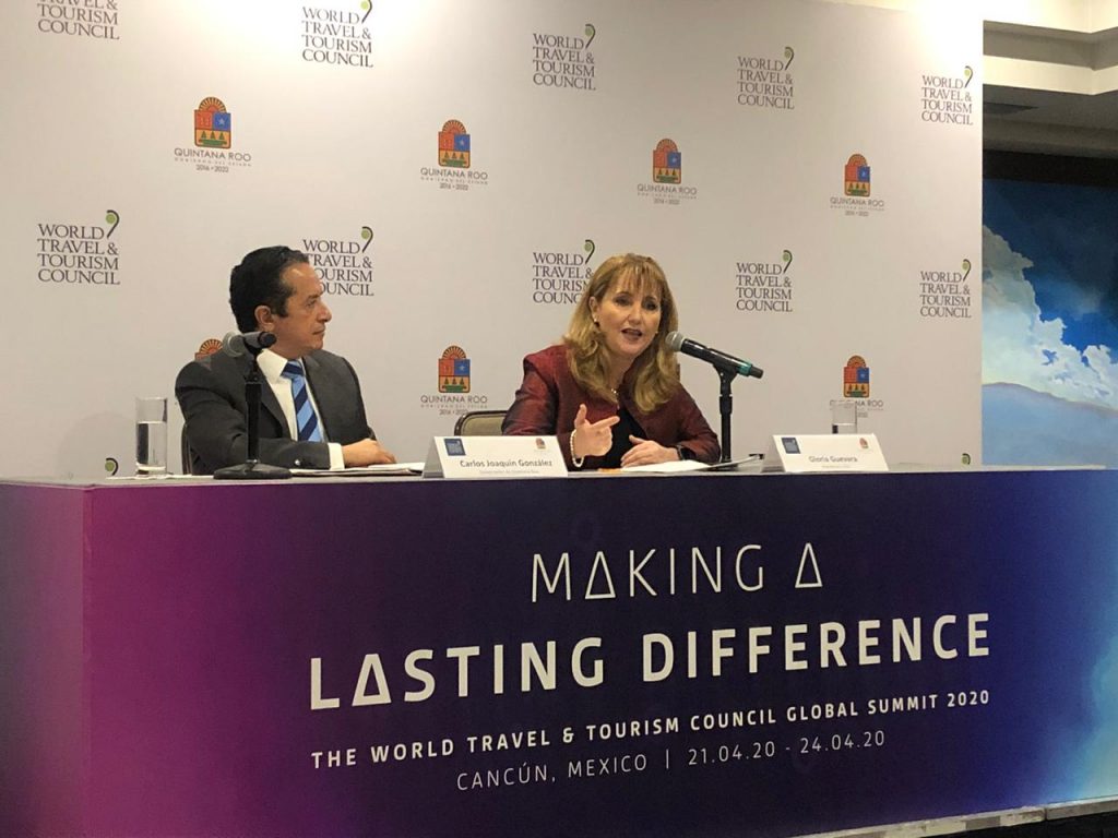 Cancún, Q. Roo, Miércoles 11 de marzo 2020, poderycrítica.- En el marco de la rueda de prensa ofrecida por la Presidenta y CEO del Consejo Mundial de Viajes y Turismo (WTTC), Gloria Guevara Manzo, y por el Gobernador de Quintana Roo, Carlos Joaquín González, se dio a conocer que la Cumbre Mundial de Turismo se realizará en otoño del presente año, reafirmando a Cancún como sede única y destacando las bondades que posee el destino líder en turismo.