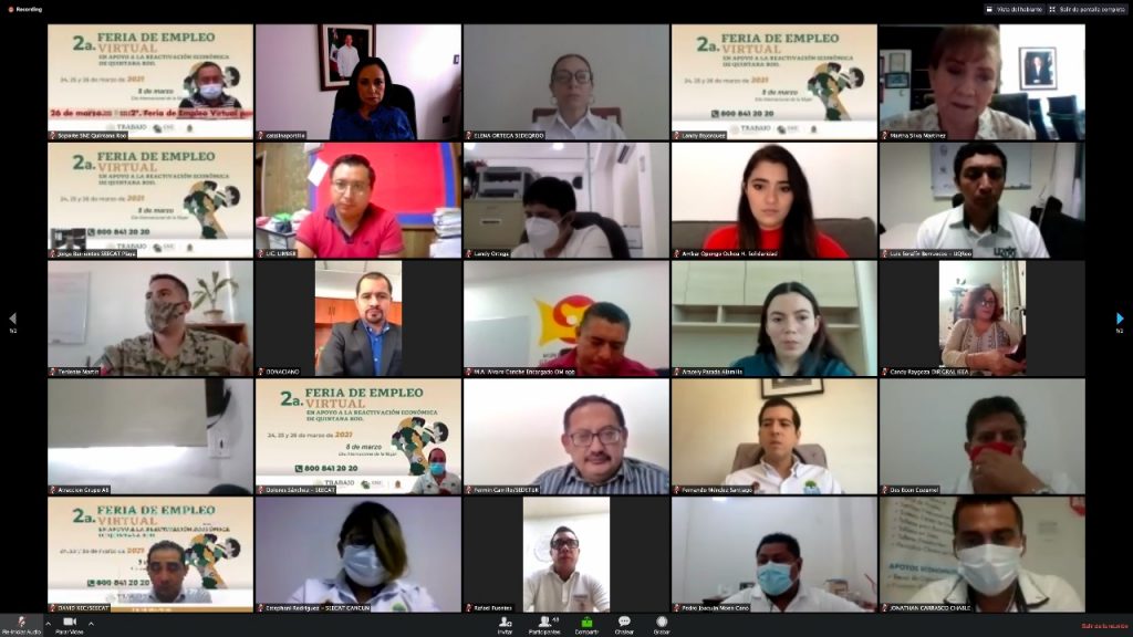 Chetumal, Q. Roo, Miércoles 24 de Marzo de 2021, poderycrítica.- La Secretaría de Trabajo y Previsión Social, a través del Servicio Estatal del Empleo y Capacitación para el Trabajo inauguraron este miércoles 24 de marzo en horario de 10:00 a 14:00 horas la “2a Feria de Empleo Virtual en apoyo a la reactivación económica de Quintana Roo”, llevada a cabo a través de la Plataforma Videoconferencias Telmex y transmitido a través de la cuenta @SNEQuintanaRoo en Facebook Live. El evento tendrá una duración de tres días, siendo hoy el primero de ellos y los días subsecuentes los programados para la aplicación de entrevistas laborales.