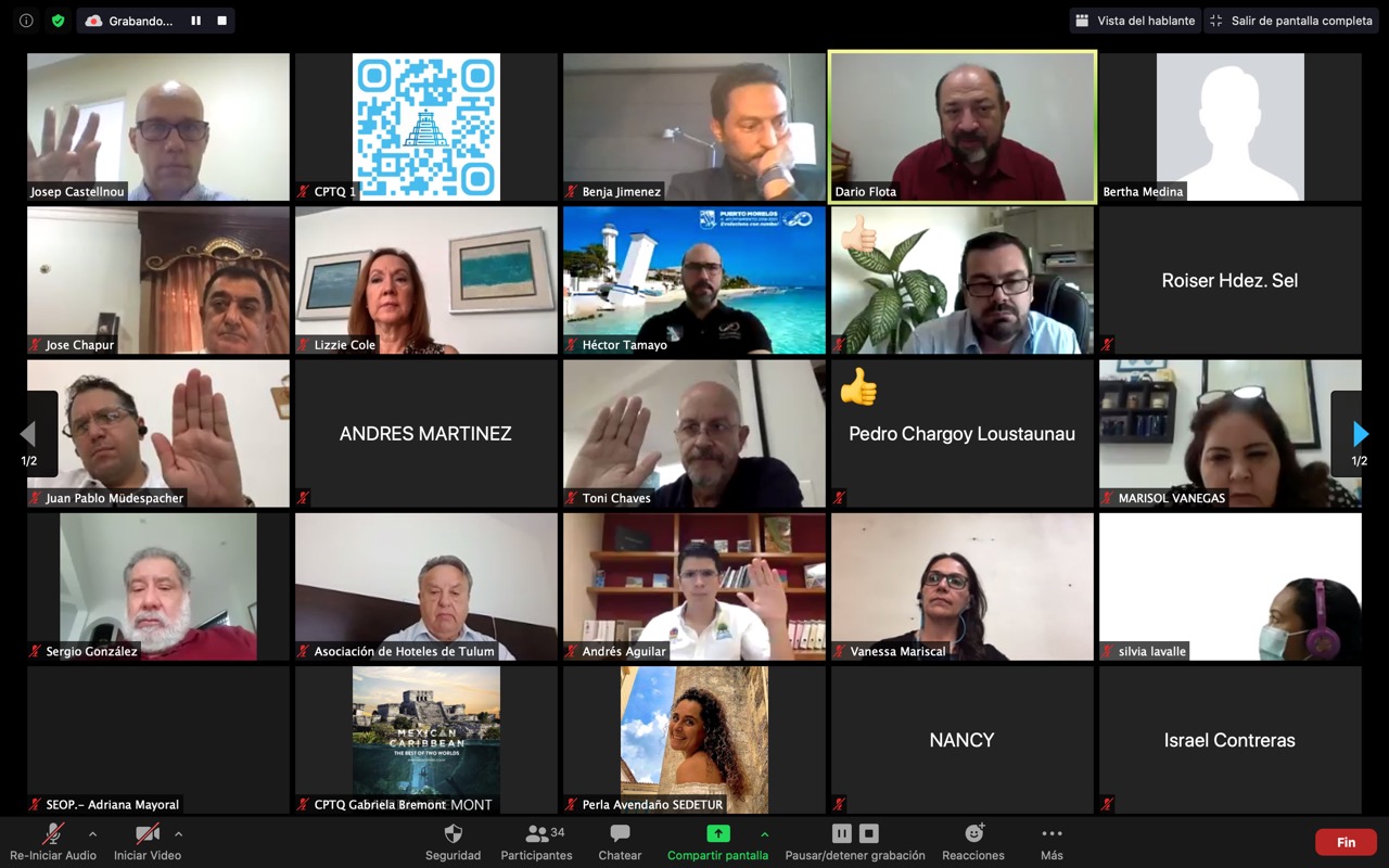 En la reunión virtual estuvieron presentes: Marisol Vanegas Pérez, Secretaria de Turismo de Quintana Roo; Andrés Aguilar Becerril, Subsecretario de Promoción Turística de SEDETUR; Ricardo Román Sánchez, Subsecretario de Finanzas y Planeación; Roiser Rodimiro Hernández, Director de Entidades Paraestatales; Adriana Mayoral, Subsecretaria de Evaluación y Vinculación de la Secretaría de Obras Públicas; Silvia Lavalle Reyes, Directora de Biodiversidad y Áreas Naturales Protegidas de la SEMA; María Córdova y Pedro Chargoy, Desarrollador de Proyectos de SEDE; Fernando Ramírez Santamaría, Coordinador de Política de Ordenamiento Territorial, Desarrollo Urbano y Vivienda; Dionicio Aragón, Enlace con Entidades del Sector Educativo; Roberto Cintrón, Presidente de la Asociación de Hoteles de Quintana Roo; Antonio Chávez, Presidente de la Asociación de Hoteles de la Riviera Maya; José Castellnou, Vicepresidente de la Asociación de Hoteles de Riviera Maya; Juan Pablo Müdespacher Blasco, Presidente de la Asociación de Hoteles de Cozumel; Bertha Medina Núñez, Presidente de la Asociación de Hoteles y Servicios turísticos del Centro y Sur de Quintana Roo; Sergio González, Presidente Ejecutivo de la Asociación Mexicana de Agencias de Viaje de Quintana Roo; Nancy Patricia Rivero, Coordinadora de Entidades del Sector Turístico y Económico; José Chapur, Director general de Palace Resorts; Carlos Constandse, Vicepresidente de Grupo Xcaret; Héctor Tamayo, Director de Turismo de Puerto Morelos, Juan Noriega y David Ortiz, Director Ejecutivo y Presidente de Asociaciones de la Asociación de Hoteles de Tulum, respectivamente; y Darío Flota Ocampo, Director General del Consejo de Promoción Turística de Quintana Roo.