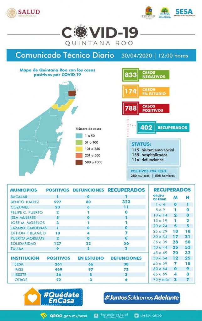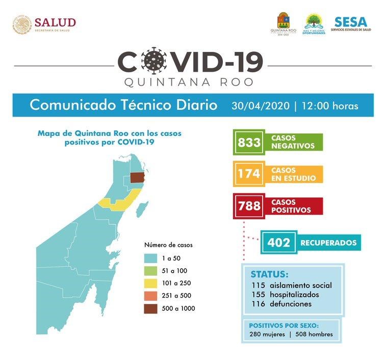 La Secretaría de Salud en el estado reportó que al jueves 30 de abril se han presentado en Quintana Roo 788 casos positivos de Covid-19.
