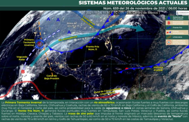 Por último, el Frente Frío No.11, se desplaza al este-sureste generando descenso de temperaturas, nubosidad variable con nubes de tormenta, con lluvias acompañadas de chubascos con probabilidad de actividad eléctrica dispersa, viento frío y arrachado del norte y noreste, por el momento no hay probabilidad de influenciar a la península de Yucatán y el estado de Quintana Roo.