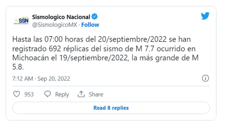 En el último reporte del Sismológico se indica que se han registrado 692 réplicas del sismo de 7.7 de ayer, siendo la más grande de 5.8 grados.