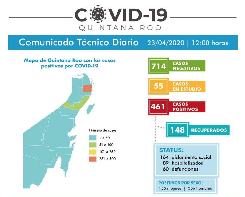 Chetumal, Q. Roo, Jueves 23 de Abril de 2020, poderycrítica.- En las últimas 24 horas se reportaron 5 muertes más por coronavirus en Quintana Roo. La Secretaría de Salud en Quintana Roo informó que los casos de fallecimiento por Covid-19 pasaron de 55 a 60.