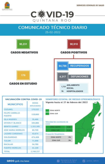 En su reporte de este día, la Secretaría estatal de Salud refiere que hasta el 25 de febrero de 2022 se confirmaron 90, 910 casos positivos de COVID-19 en Quintana Roo, recuperado 84,786 personas, aplicadas 2 millones 749,227 dosis de vacunas y reportado 4,317 defunciones.