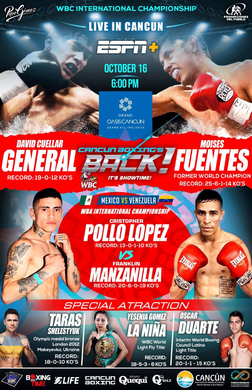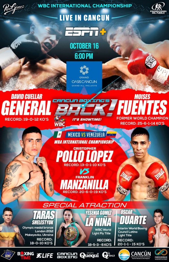 Destacan además las participaciones de la campeona absoluta de peso Minimosca del Consejo Mundial de Boxeo (CMB-WBC, por sus siglas en inglés), la cancunense Yesenia “Niña” Gómez, quien enfrentará a la queretana Itzayana “Diva” Cruz en pelea de preparación señalada en peso Mosca a 8 rounds; y del invicto jalisciense Cristopher “Pollo” López enfrentando al peligroso noqueador venezolano y clasificado mundial, Franklin Manzanilla, en un duelo coestelar que huele a dinamita pura.