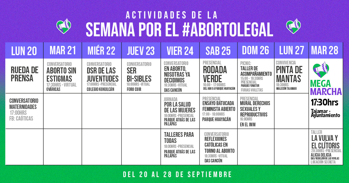 La semana de actividades, que inició el pasado 20 de septiembre, ha incluido diversos conversatorios virtuales y a partir de hoy viernes 24, incluirá diversas actividades presenciales, tales como talleres en torno a la salud física y sexual de las mujeres, pinta de murales y mantas, batucada, una rodada verde y concluirá el martes 28, con una megamarcha, del Malecón Tajamar al Ayuntamiento de Benito Juárez.