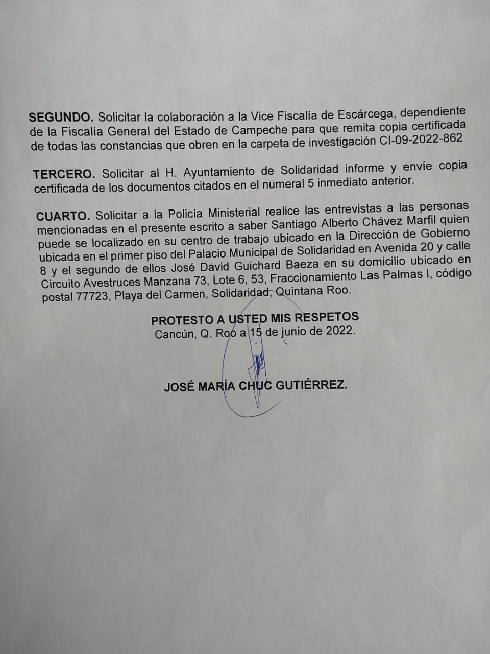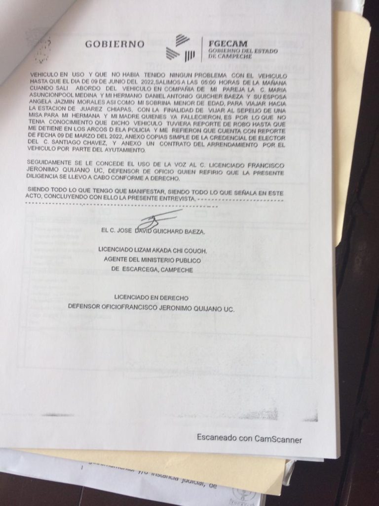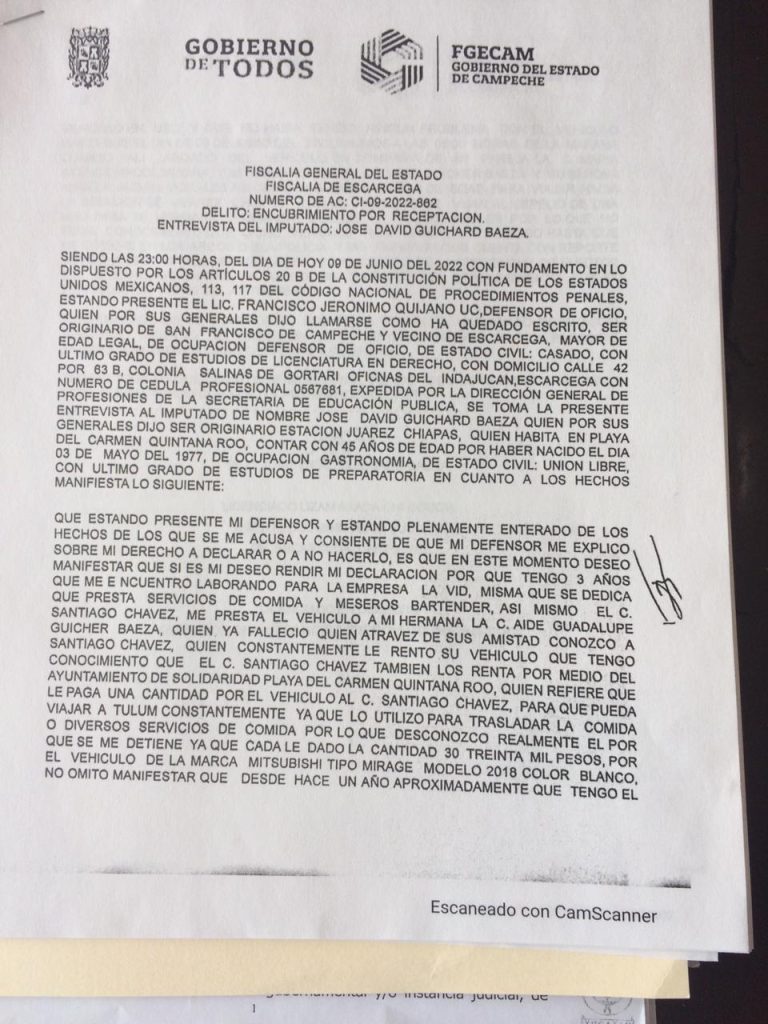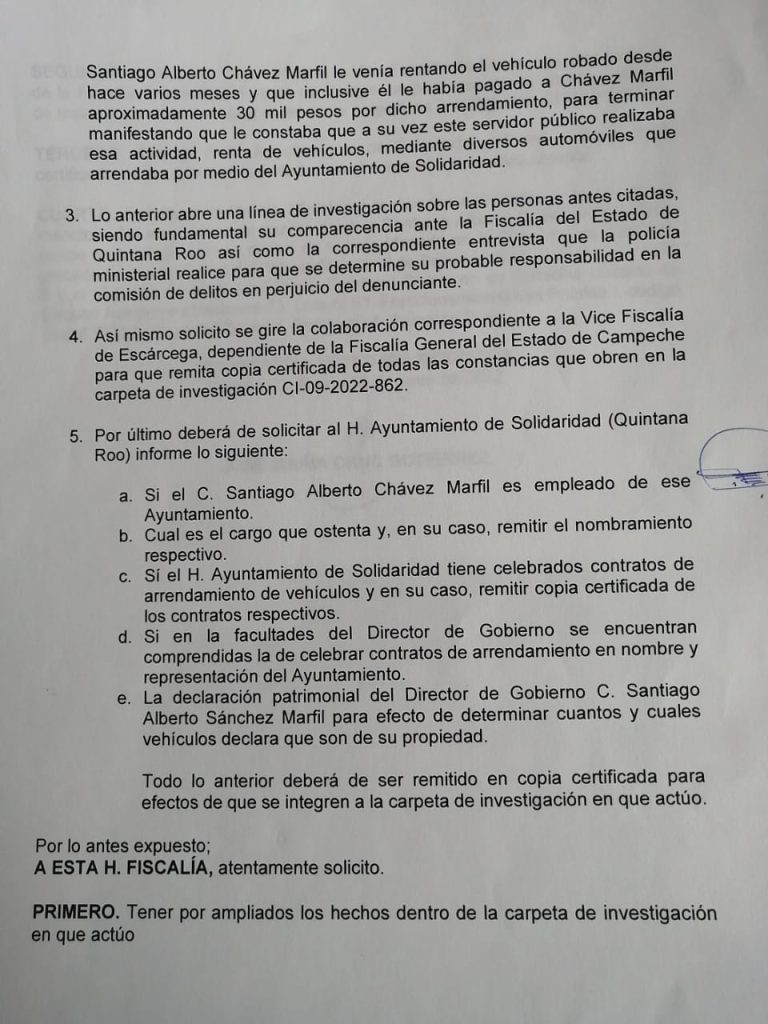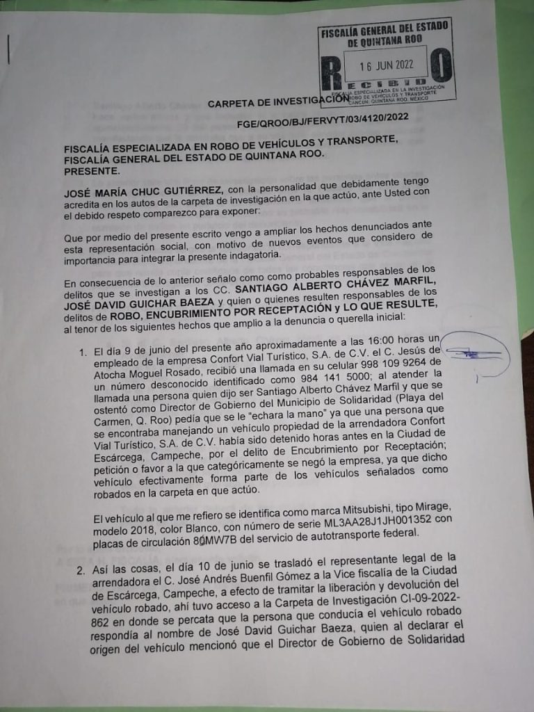 El representante legal de la arrendadora acudió a la Vicefiscalía de la Ciudad de Escárcega, Campeche, a efecto de tramitar la liberación y devolución del vehículo robado, ahí tuvo acceso a la Carpeta de Investigación CI-09-2022-862 en donde se percata que la persona que conducía el vehículo robado respondía al nombre de José David Guichar Baeza, quien al declarar el origen del vehículo mencionó que el Director de Gobierno de Solidaridad, Santiago Alberto Chávez Marfil, le venía rentando el vehículo robado desde hace varios meses y que inclusive él le había pagado a Chávez Marfil aproximadamente 30 mil pesos por dicho arrendamiento,.