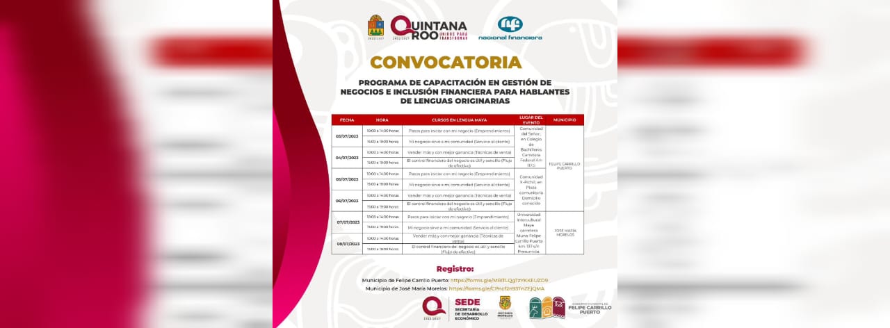PODER Y CRÍTICA | REDACCIÓN | El Gobierno del Estado que encabeza Mara Lezama Espinosa a través de la Secretaría de Desarrollo Económico (SEDE) y en alianza estratégica con la Banca de Desarrollo Nacional Financiera (NAFIN), emitió la convocatoria para el Programa de Capacitación en Gestión de Negocios e Inclusión Financiera para Hablantes de Lenguas Originarias en Quintana Roo.