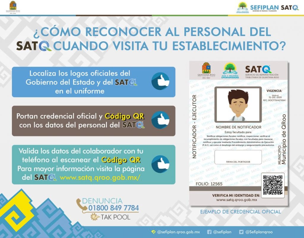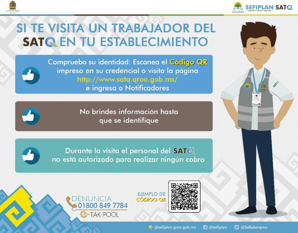 Entre las acciones que se destacan, se ha realizado la campaña al NO cobro de trámites y servicios por parte de SEFIPLAN y SATQ en redes sociales, y la difusión de recomendaciones a tomar en cuenta al momento de agendar una cita, en la que se menciona que tiene que ser a nombre del propietario y/o representante legal, además de la identificación de los notificadores que portan uniforme con logotipos de Gobierno del Estado, llevando consigo su credencial con código QR para verificar su información a través del portal www.satq.qroo.gob.mx.