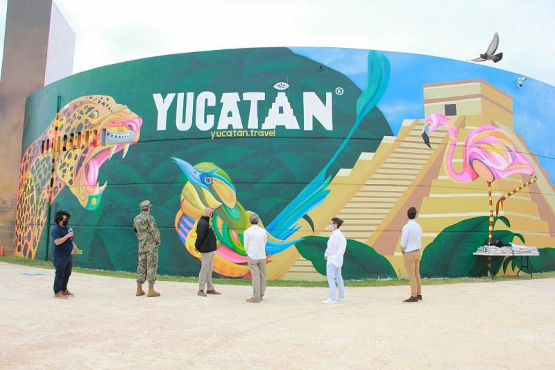La ceremonia se efectuó frente al nuevo mural en la Terminal Internacional de Cruceros en el Puerto de Progreso, una acción y estrategia de promoción tipo BTL, realizada por la Dirección de Mercadotecnia de la Sefotur, que tiene como objetivo, además de mejorar la imagen del sitio y ser la primera cara que verán las y los paseantes al llegar a la entidad, posicionar la nueva marca turística y campaña «Yucatán es color».