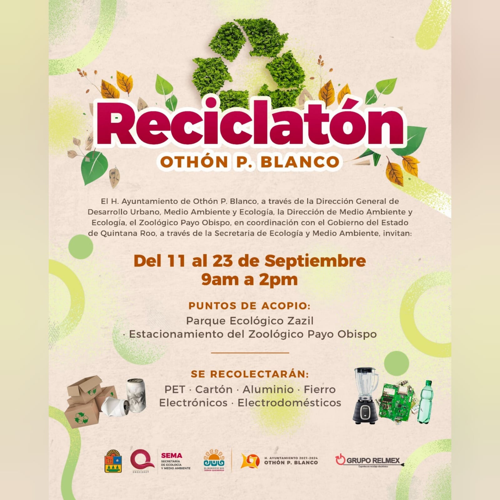 PODER Y CRÍTICA | REDACCIÓN | Para tener un medio ambiente más sano, limpio y resiliente que permite a las futuras generaciones contar con entornos saludables, el gobierno de Mara Lezama Espinosa a través de La Secretaría de Ecología y Medio Ambiente (SEMA) que encabeza Huguette Hernández Gómez, en coordinación con el Ayuntamiento de Othón P. Blanco y el Zoológico Payo Obispo, realizan el Reciclatón del 11 al 23 de septiembre.