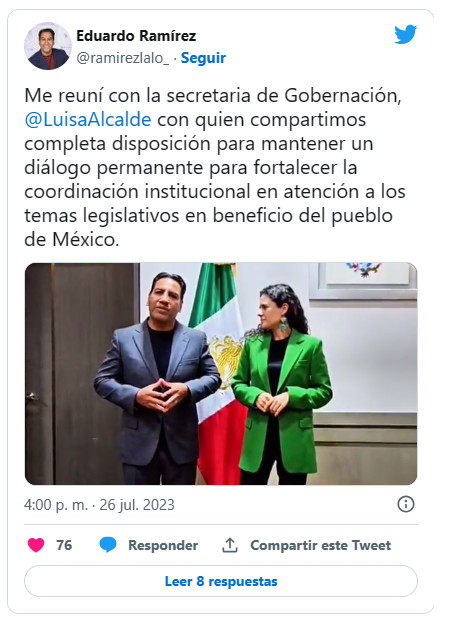 “Me reuní con la secretaria de Gobernación, @LuisaAlcalde con quien compartimos completa disposición para mantener un diálogo permanente para fortalecer la coordinación institucional en atención a los temas legislativos en beneficio del pueblo de México”, expuso Ramírez Aguilar.