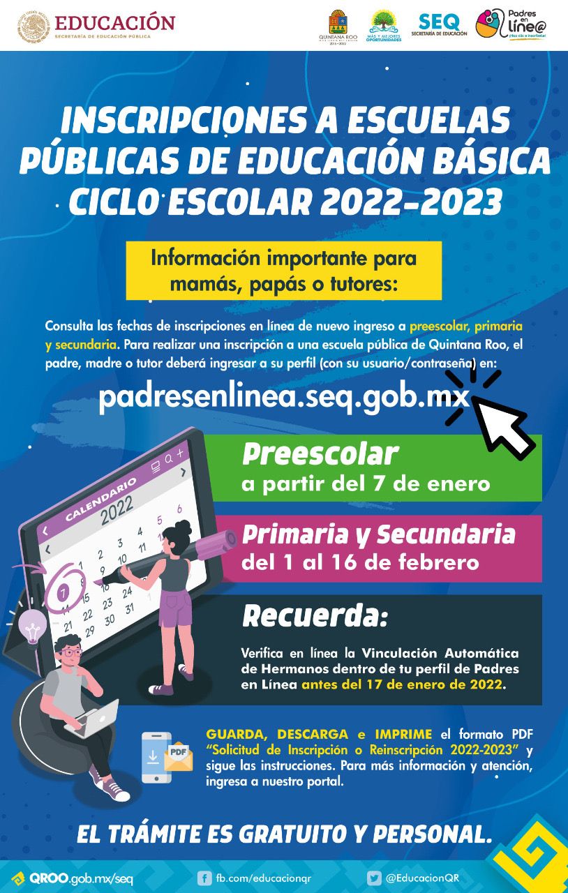 PODER Y CRÍTICA | Chetumal, Quintana Roo.- Las fechas para la inscripción y cambios a escuelas públicas de educación preescolar para el ciclo escolar 2022-2023, serán del 07 de enero al 16 de febrero de 2022 y las inscripciones correspondientes al primer grado de primaria y primer grado de secundaria, del 1 al 16 de febrero de 2022, informó la Secretaría de Educación de Quintana Roo (SEQ).