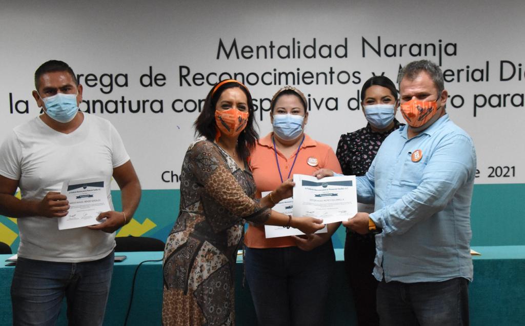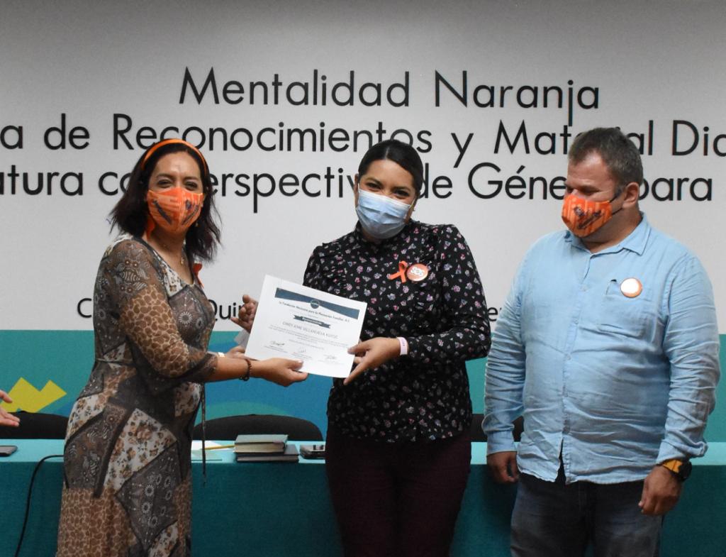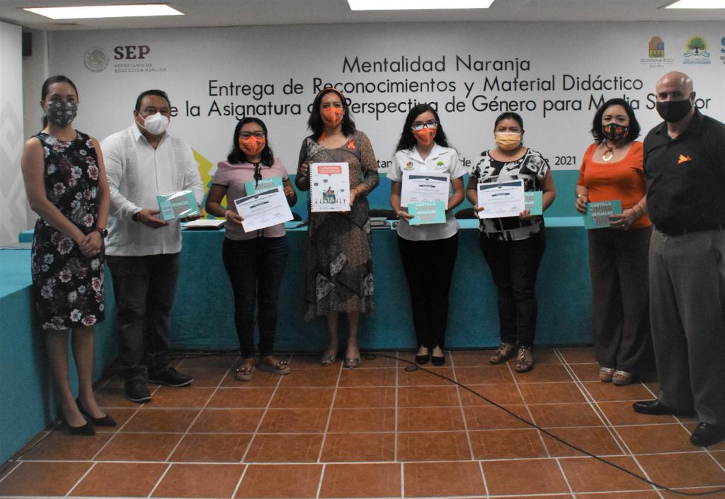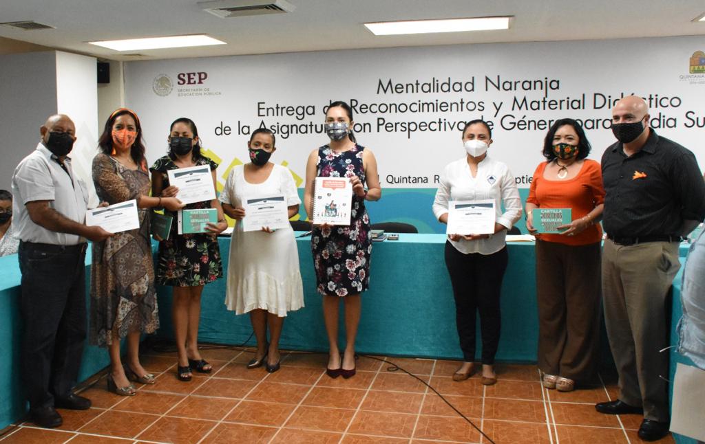 Chetumal, Q. Roo, Lunes 27 de Septiembre de 2021, poderycrítica.- En el marco del Día Naranja, que se conmemoró el pasado 25 de septiembre, la Secretaría de Educación de Quintana Roo, Ana Isabel Vásquez Jiménez reconoció la labor que desempeñan las y los docentes que imparten la asignatura de Educación con Perspectiva de Género de Media Superior, por ser los principales promotores de construir un clima de respeto y paz entre las personas.