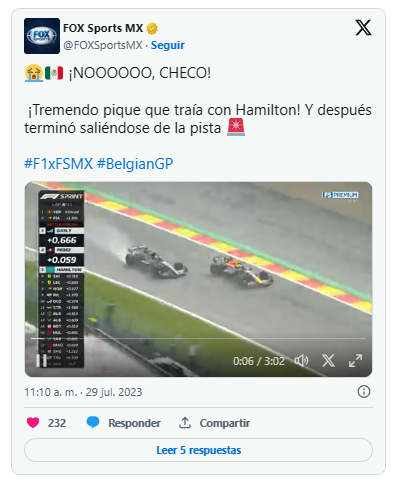 Poder y Crítica | Redacción | El piloto mexicano, Sergio ‘Checo’ Pérez abandonó la carrera sprint del Gran Premio de Bélgica luego de tener un contacto con el Mercedes de Lewis Hamilton que dañó la parte trasera del RB19 del mexicano, esto cuando luchaban por la cuarta posición de competencia.