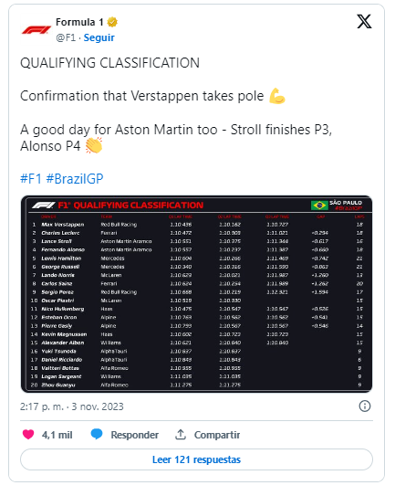 Una bandera roja apareció y el control de carrera anunció que se había terminado la sesión. Max Verstappen quedó primero, seguido de Charles Leclerc, Lance Stroll, Fernando Alonso, Lewis Hamilton, George Russell, Lando Norris, Carlos Sainz, Sergio Pérez y Oscar Piastri.