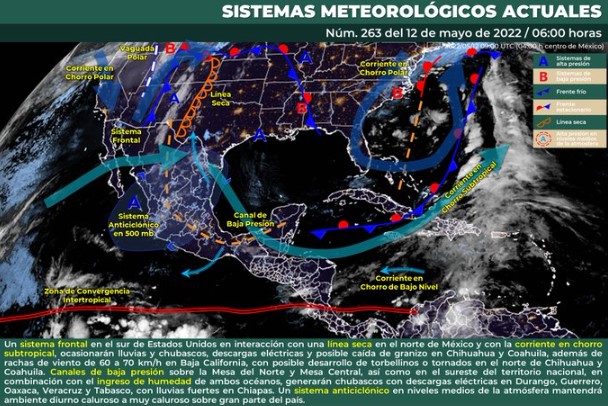 Finalmente, un sistema anticiclónico en niveles medios de la atmósfera mantendrá ambiente diurno cálido a caluroso sobre gran parte del país, con temperaturas máximas muy calurosas, (superiores a 40°C), en regiones de Sonora, Sinaloa, Chihuahua, Nayarit, Jalisco, Michoacán, Morelos y Guerrero.