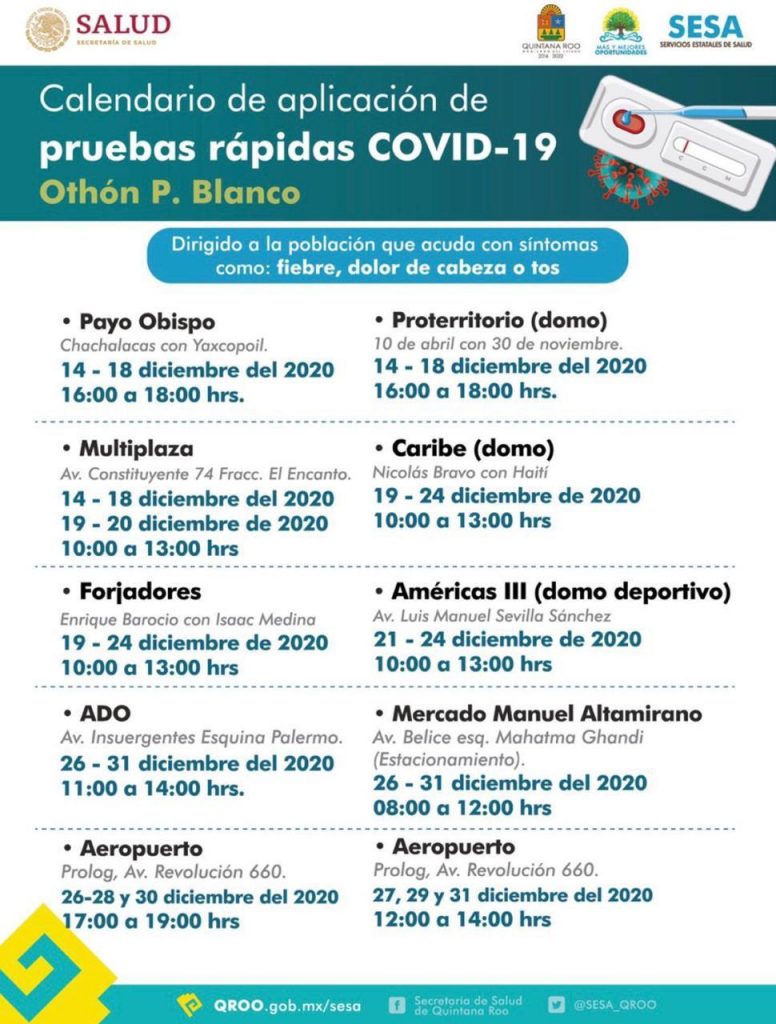Del 12 al 31 de diciembre en Chetumal se tiene prevista la instalación de 10 módulos, en diferentes puntos de la ciudad, con el objetivo de detectar contagios y reducir el riesgo entre la población.