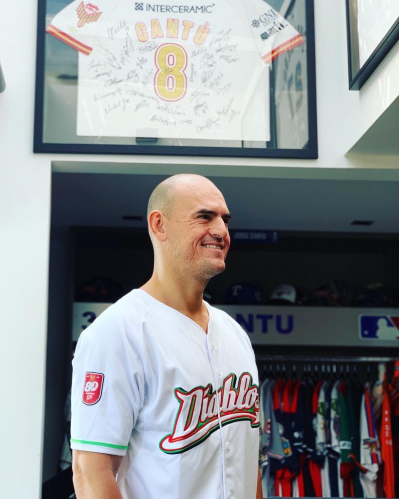 Jorge Cantú, primera base de la novena escarlata, fue el encargado de mostrar la nueva franela de los Diablos durante una transmisión en vivo desde su casa para el programa de televisión.