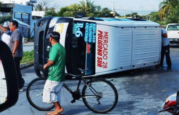 PODER Y CRÍTICA | REDACCIÓN | La volcadura de una combi de la Ruta 6, con número económico 884, se registró la mañana de este sábado en el cruce de las avenidas México y 50, a la altura de la Supermanzana 510.