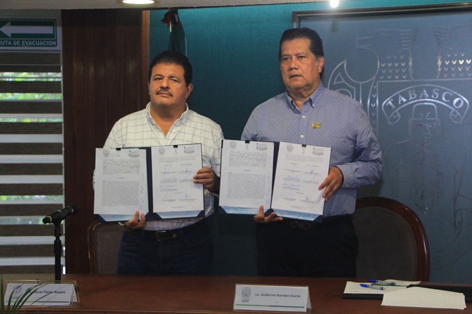 PODER Y CRÍTICA | REDACCIÓN | El alcalde Oscar Ferrer Abalos y el Rector de la Universidad Juárez Autónoma de Tabasco, Guillermo Narvaez Osorio signaron un convenio de colaboración para la creación de un Centro de Educación a Distancia en el poblado Pedro C. Colorado (C-26) del municipio de Huimanguillo.