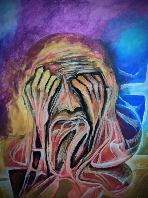 La muestra consta de catorce obras plásticas de mediano formato en las que usa la técnica de acrílico sobre tela y en ella se refleja la interpretación que hace el artista visual sobre la pandemia de la covid-19 y su efecto social.