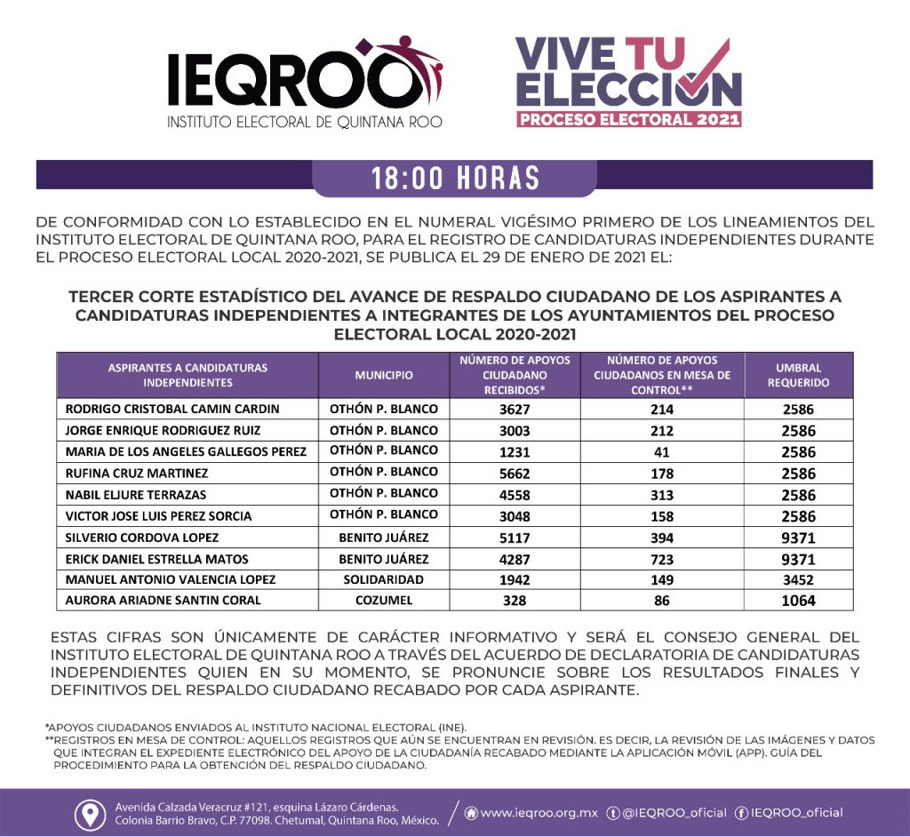 El IEQROO emitió la tarde de este viernes 29 de enero el tercer corte estadístico de las 18:00 horas, correspondiente al avance que registra este proceso de los aspirantes de cada municipio.