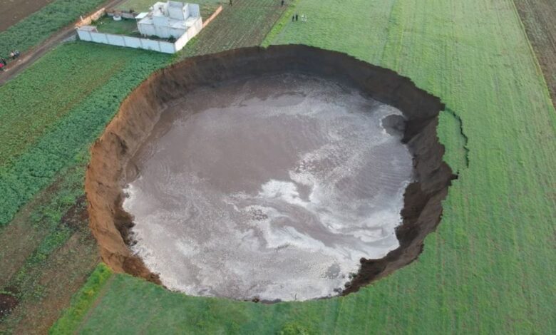El socavón inició con un diámetro de cinco metros y el jueves ya tenía más de 80, por 29 de profundidad, y sigue creciendo.
