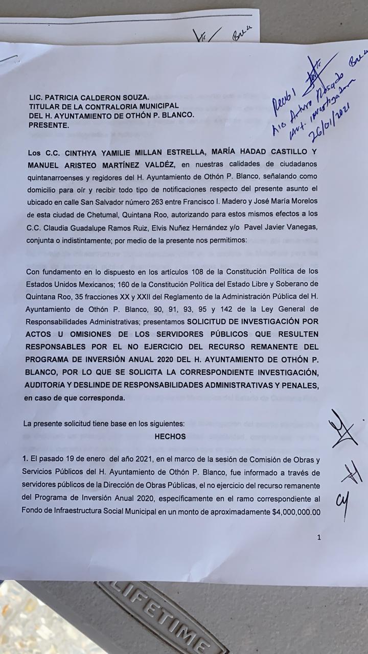 Chetumal, Q. Roo, martes 26 de enero de 2021, poderycrítica.- Regidores del Ayuntamiento de Othón P. Blanco presentaron una solicitud de investigación en contra de la administración municipal de Othón P. Blanco, por la pérdida de 4 millones de pesos de remanentes en obra pública.