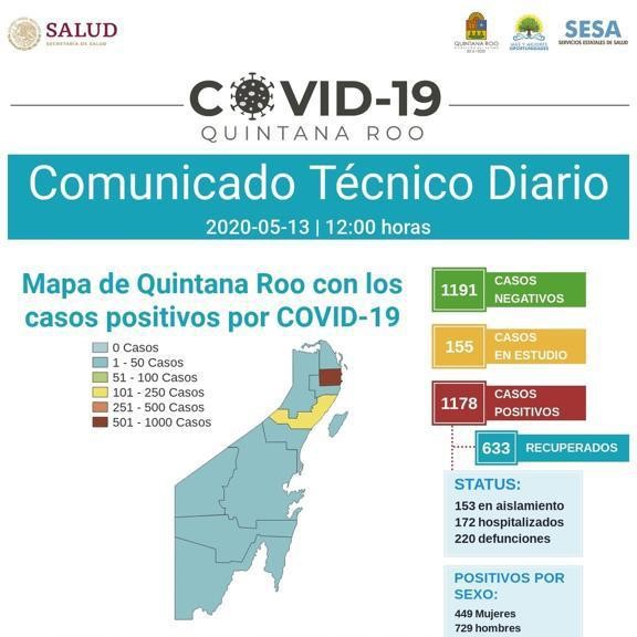 De acuerdo con el reporte de la Secretaría de Salud en el estado, con fecha de miércoles 13 de mayo, en Quintana Roo han fallecido 220 personas por complicaciones de coronavirus.