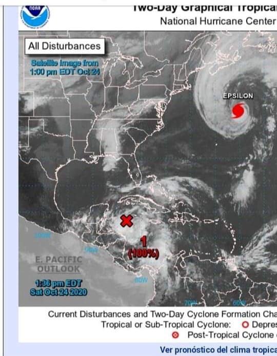 Cancún, Q. Roo, Sábado 24 de Octubre de 2020, poderycrítica.- Se informa que el satélite, radar y observaciones de la superficie indican que un área amplia de baja presión localizada a cerca de 500 km al este-sureste de Cancún QRoo.