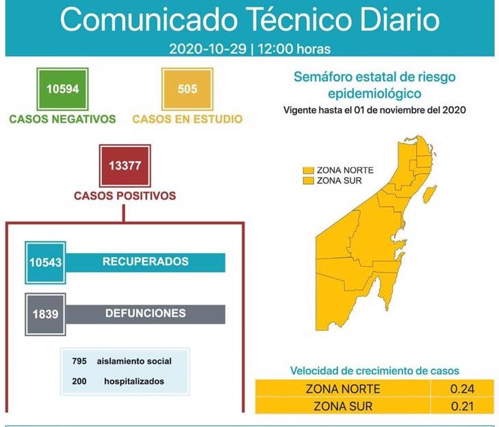 Chetumal, Q. Roo, Jueves 29 de Octubre del 2020, poderycrítica.- De los 13,377 casos positivos que se han registrado hasta el momento por Covid-19 en Quintana Roo, 1839 personas han perdido la batalla ante este mal.