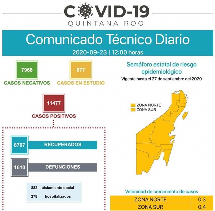 Chetumal, Q. Roo, Miércoles 23 de septiembre de 2020, poderycrítica.- ya son 1610 defunciones por COVID-19, de los 11,477 casos positivos que se han registrado a lo largo y ancho de Quintana Roo.