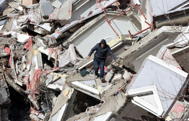 Un hombre camina entre los escombros de un edificio derrumbado en Kahramanmaras, Turquía. (AFP)