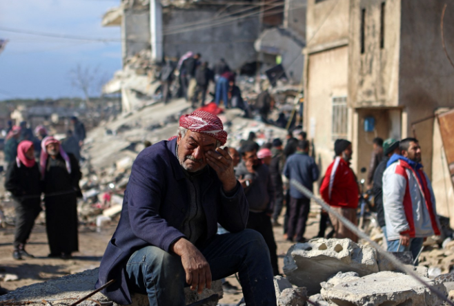 Un hombre sirio llora sentado sobre los escombros de un edificio derrumbado en la ciudad de Jindayris. (AFP)
