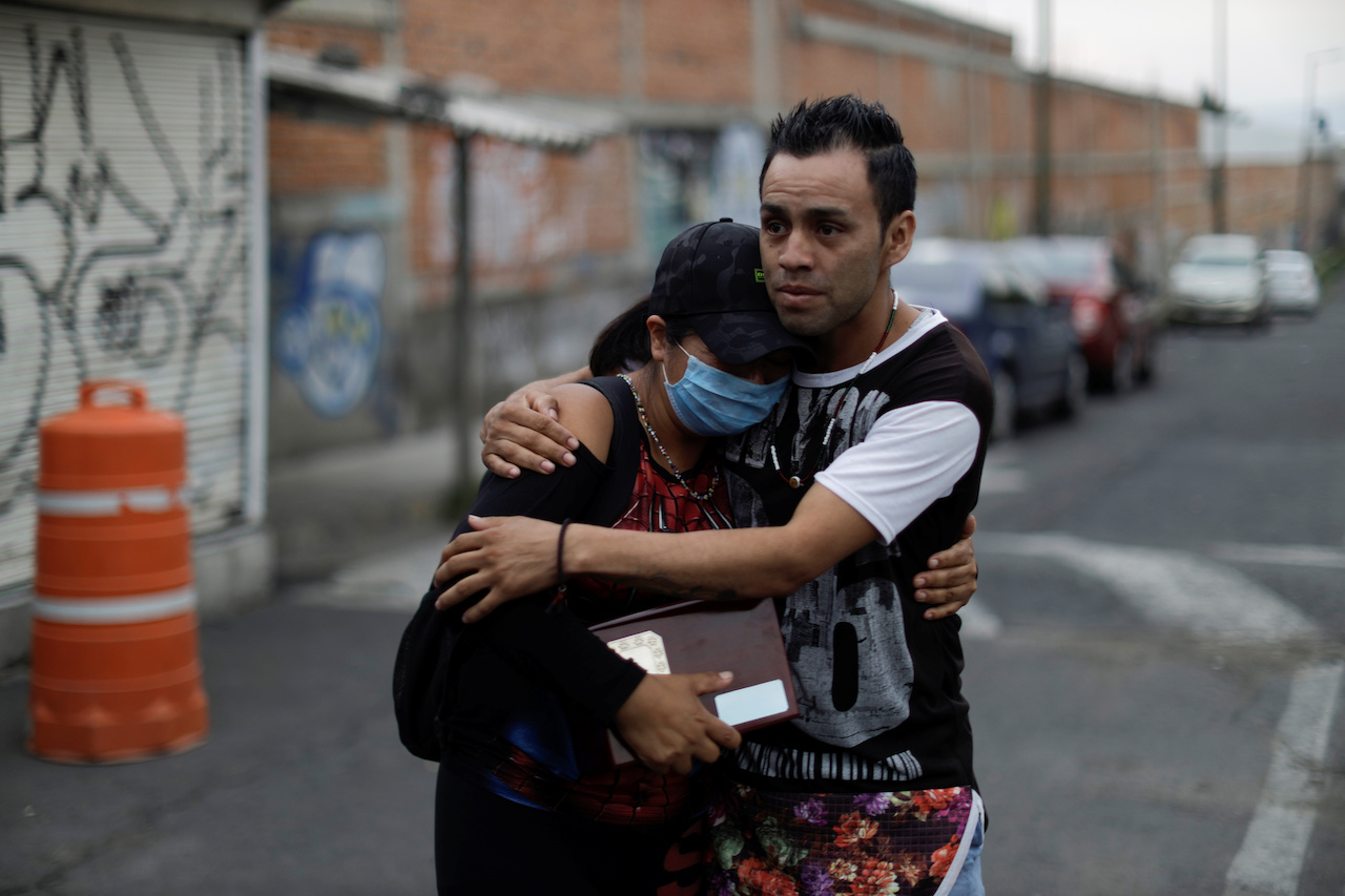 Carolina Hernandez Escobar is comforted by a family member while holding an urn containing the remains of her mother Lucia Escobar Paredes, 75, who died of the coronavirus disease (COVID-19), outside of Izaz crematorium, in Mexico City, Mexico April 22, 2020. REUTERS/Luis Cortes