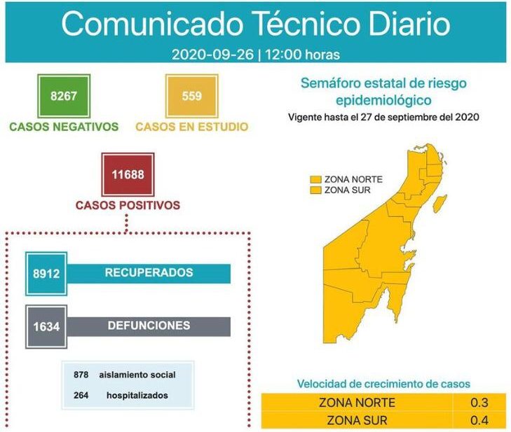 Chetumal, Q. Roo, Sábado 26 de septiembre de 2020, poderycrítica.- Quintana Roo suma 11,688 casos positivos y 1634 defunciones por coronavirus en lo que va de la pandemia, de acuerdo al comunicado técnico diario existen 8912 personas que se han recuperado, 559 se encuentran bajo estudio y 1142 casos activos de los cuales 878 se encuentran en el aislamiento social y 264 se encuentran hospitalizados.