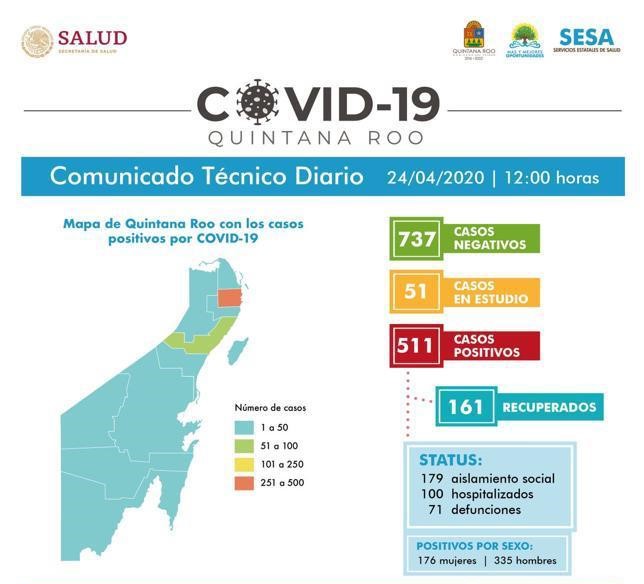 Chetumal, Q. Roo, Viernes 24 de Abril de 2020, poderycrítica.- A 511 ascendió la cifra de personas enfermas por coronavirus en Quintana Roo, reportó este viernes la Secretaría Estatal de Salud.