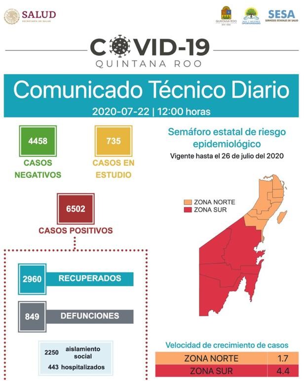 «Hasta las 12 horas del 22 de julio, se han notificado 2 mil 960 personas recuperadas, 4 mil 458 casos negativos, 735 casos en estudio, 6 mil 502 casos positivos y 849 defunciones relacionadas a Covid-19», explicó la dependencia.