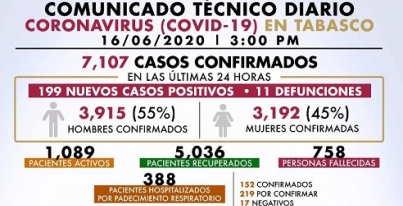 Tabasco, 17 junio; poderycritica.-La pandemia del COVID-19 sumó este martes siete mil 107 casos confirmados en Tabasco, por lo que la Secretaría de Salud del Estado nuevamente exhortó a los tabasqueños a fortalecer la medidas de higiene, sana distancia y resguardo domiciliario, para lograr frenar el avance acelerado de contagios.