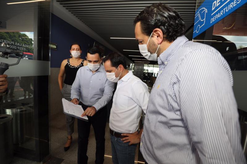 Acompañado del gerente general Región Peninsular de ADO, Eduardo Córdova Balbuena, el Gobernador atestiguó las medidas de prevención que se aplican a los pasajeros al ingresar a las salas de espera y posteriormente se trasladó al área de andenes para verificar las disposiciones que se aplican a los viajeros al subir y bajar de los autobuses.