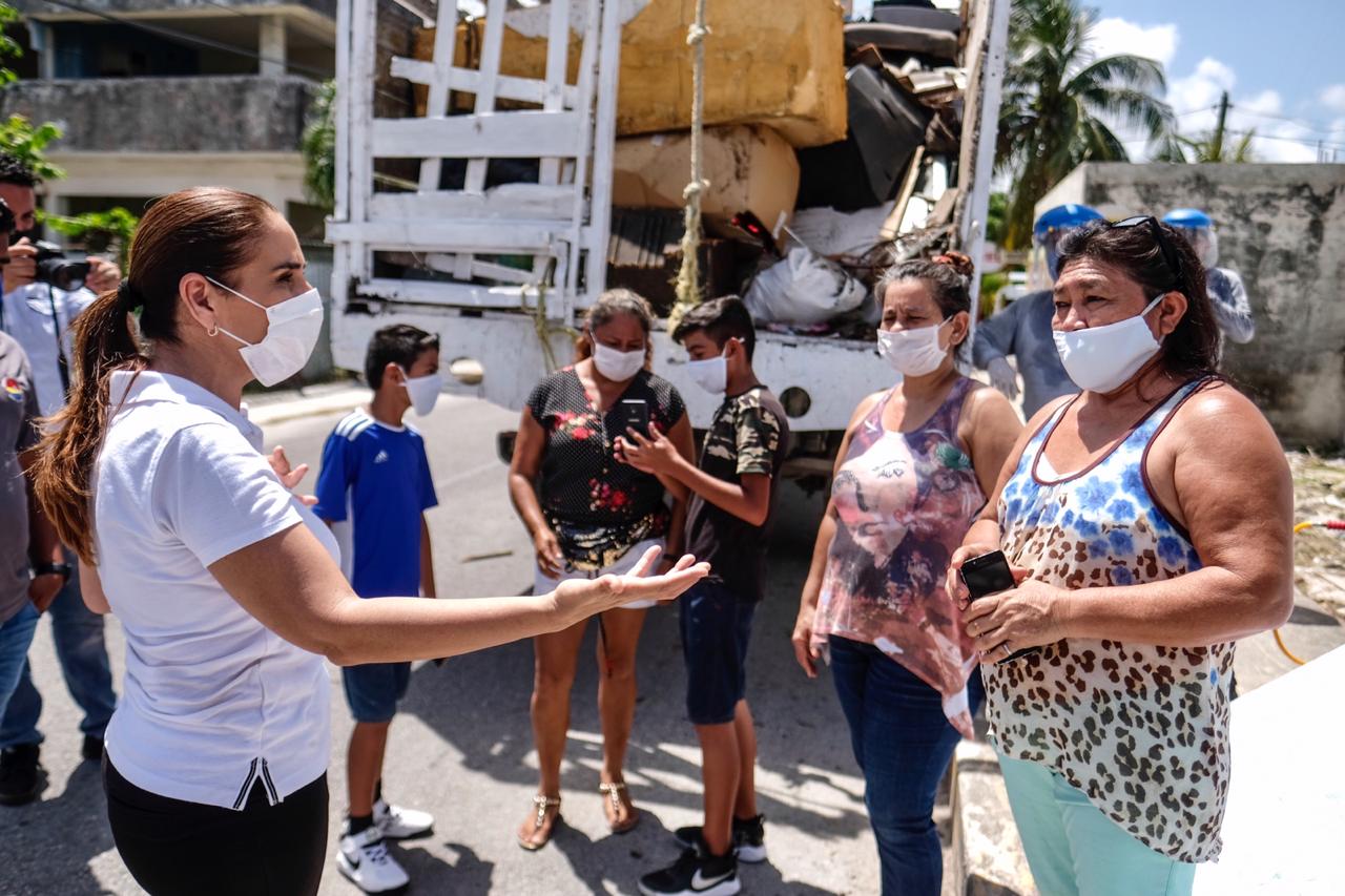 Cancún, Q.R., a 28 de junio de 2020.- La Presidente Municipal de Benito Juárez, Mara Lezama, acudió a la jornada de descacharrización en la Supermanzana 63, desde donde invitó a la ciudadanía a participar limpiando sus patios y azoteas para prevenir la proliferación de moscos.